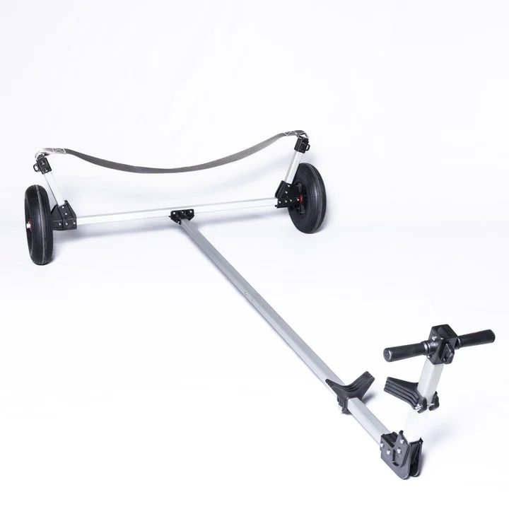 Easy dolly breakdown using the snap buttons on wheel shaft and tongue tubes, as well as wing nuts on axle tube cross fitting.
